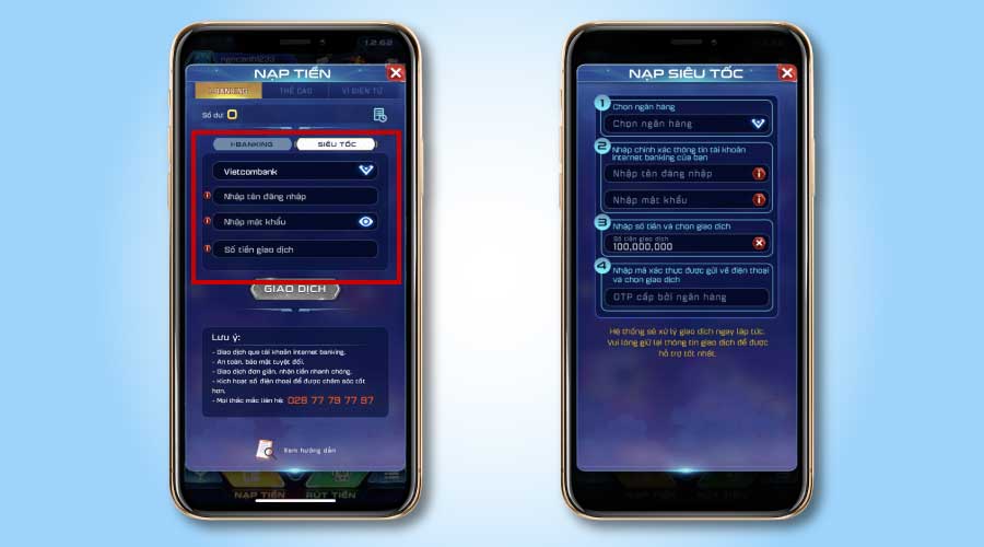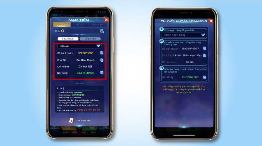 - Luôn chuyển tiền theo hình thức 24/7 để giao dịch đến người nhận nhanh nhất. Nếu không lệnh nạp sẽ bị từ chối đến khi cổng game nhận được sao kê chuyển khoản của ngân hàng.