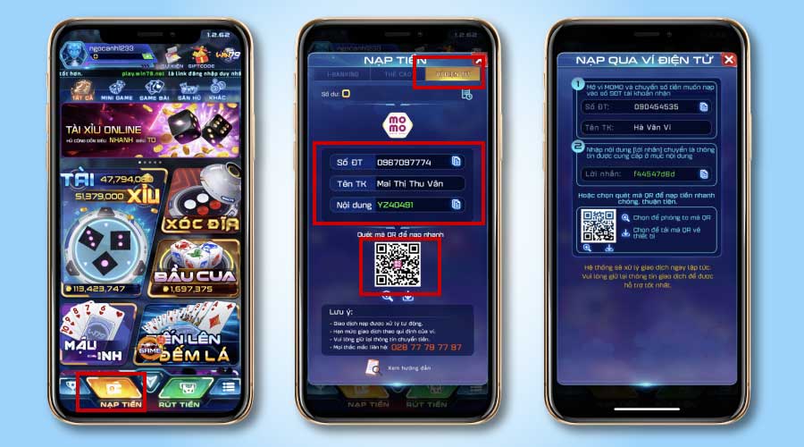 Bước 3: Lấy tài khoản Momo nhập STK của Cổng game hoặc quét trực tiếp mã QR code.