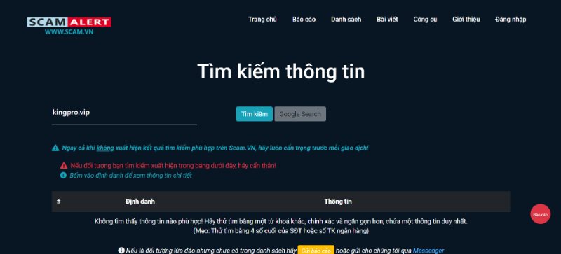 Không tồn tại thông tin trên kênh tra cứu lừa đảo