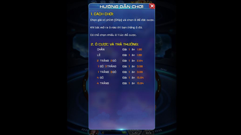 • Đặt 4 đỏ hoặc 4 trắng. Người chơi chiến thắng thì 1 ăn 15.84